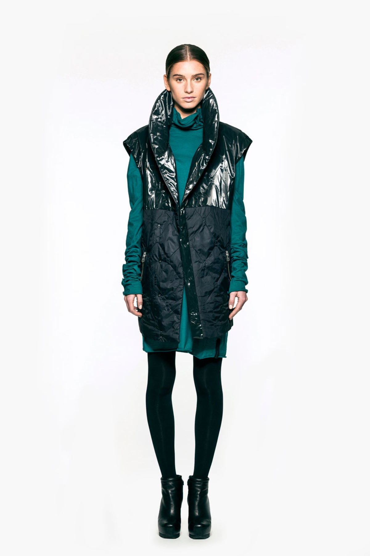 Slightly oversized quilted waistcoat. Upper part in shiny and lower part in matte fab- ric. Silver zipper pockets in front and press buttons in front. High wrap collar.
